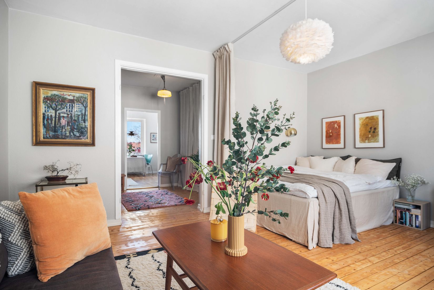 Vardagsrummet som är placerat till höger från hallen är stort och rymligt och här finns det plats för både säng, soffgrupp och till och med matbord om så önskas. Allt handlar om att möblera rätt. Ett jättefint rum som även det har plankgolv och fina målade väggar. Det mest läckra med denna bostad är att den är en etta men känns som en tvåa.