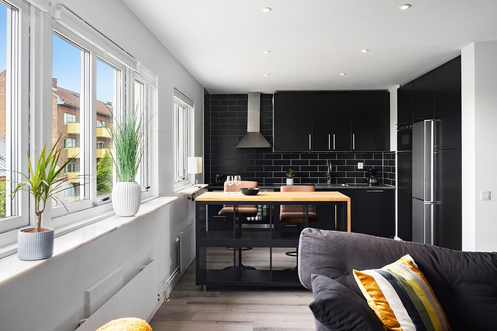 Bostaden är totalrenoverad 2018 och är fräsch och fin med ett svart läckert kök med bra förvaring. Luckorna är uppfräschade 2023. Väggarna är målade och golvet är ett modernt laminatgolv. I taket finns infällda spotlights. Spotlights finns även i hall och vardagsrum. I köket finns även en köksö med barsittning som funkar perfekt att ha som matbord eller som arbetsplats.