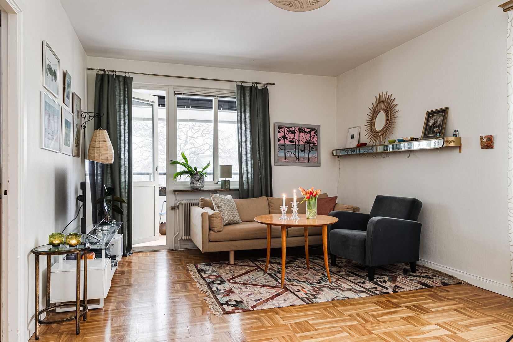 Det rymliga vardagsrummet är bostadens hjärta – en inbjudande plats med gott om utrymme för både soffgrupp och matsalsmöbel. Tack vare hörnläget flödar ljuset in och skapar en luftig och trivsam atmosfär. Härifrån kliver du direkt ut till den inglasade balkongen i härligt västerläge – den perfekta platsen att njuta av eftermiddags och kvällssolen. Det charmiga arbetsköket är både funktionellt och hemtrevligt, med bra arbetsytor och smart förvaring. Intill finns plats för en matgrupp om så önskas. Lägenheten erbjuder två väldisponerade sovrum med plats för både säng och förvaring. Ett fräscht badrum som renoverades 2000 i samband med föreningen stambyte.