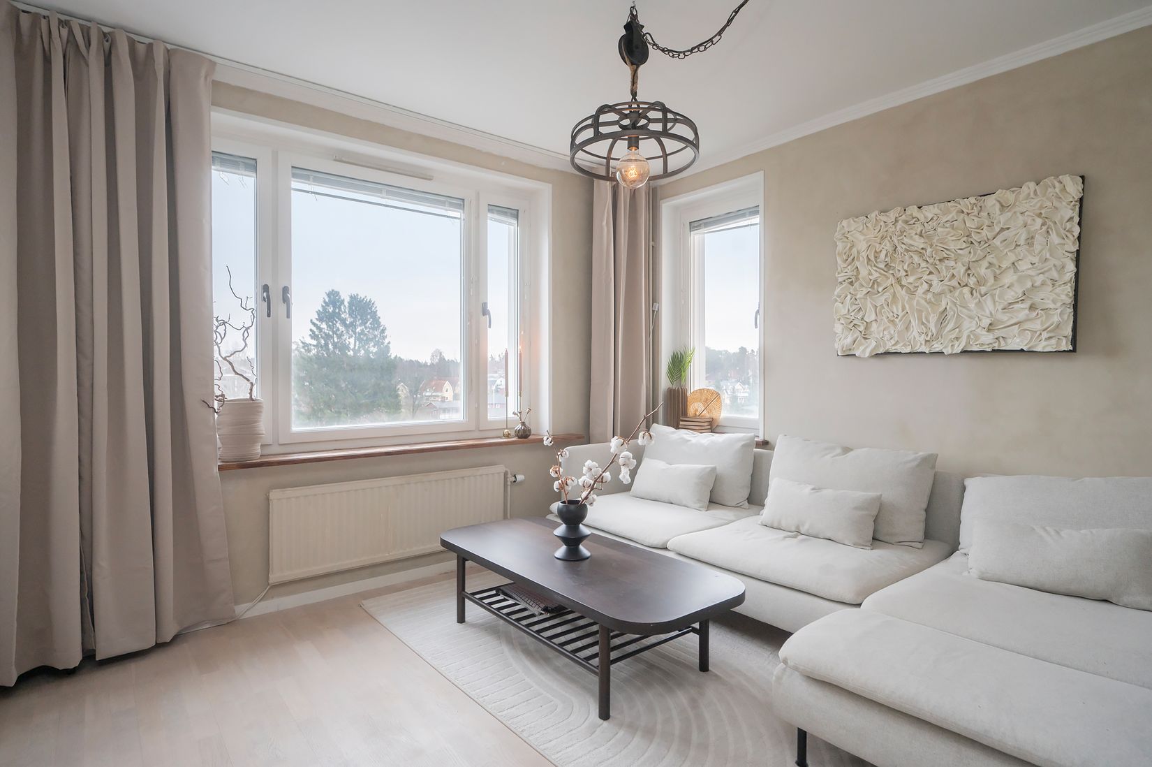 Det ljusa och luftiga vardagsrummet blir hemmets hjärta med generöst ljusinsläpp från stora fönster som skapar en härlig känsla av rymd. Härifrån når du även bostadens pärla - den stora, inglasade balkongen. Ett fantastiskt extrarum där du kan njuta av morgonkaffet, odla dina växter eller bara koppla av året runt med utsikt över Vikingavägen.