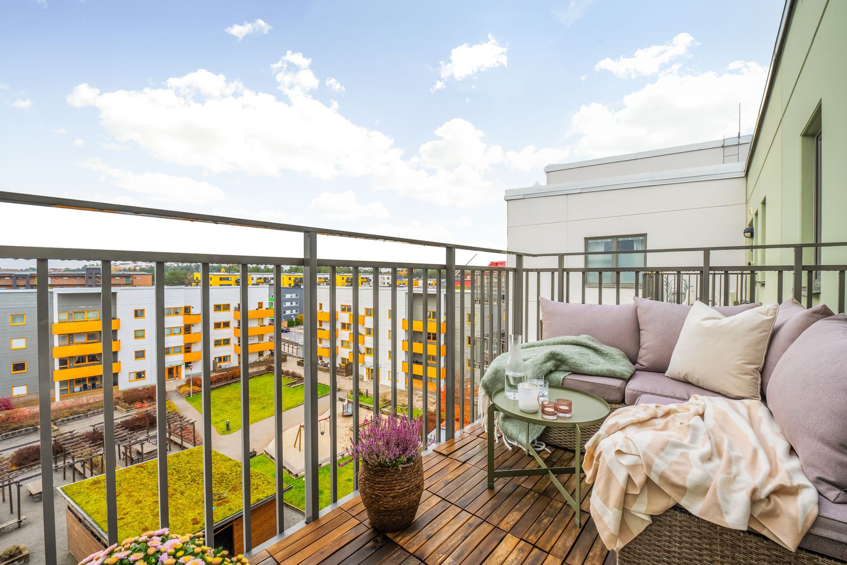 Från vardagsrummet kliver du ut till balkongen mot den lugna innergården, med goda möjligheter till många soltimmar. En plats att njuta av dagens första kopp kaffe, en stund i solen eller avslappnade kvällar.