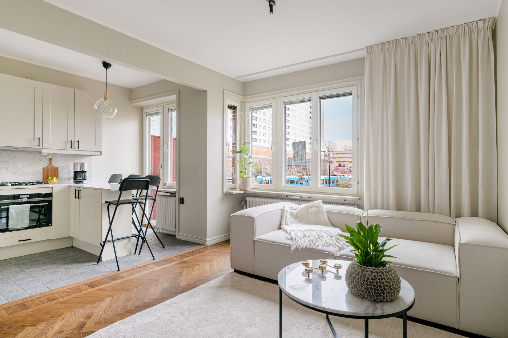 Vardagsrummet är lättmöblerat och rymmer både stor soffa, tv möbel och matplats vid behov. Köket är lyxigt renoverat med en rymlig köksö för fyra personer och erbjuder riklig förvaring i både över och underskåp samt goda arbetsytor. Här finns även utgång till en balkong med soligt söderläge.