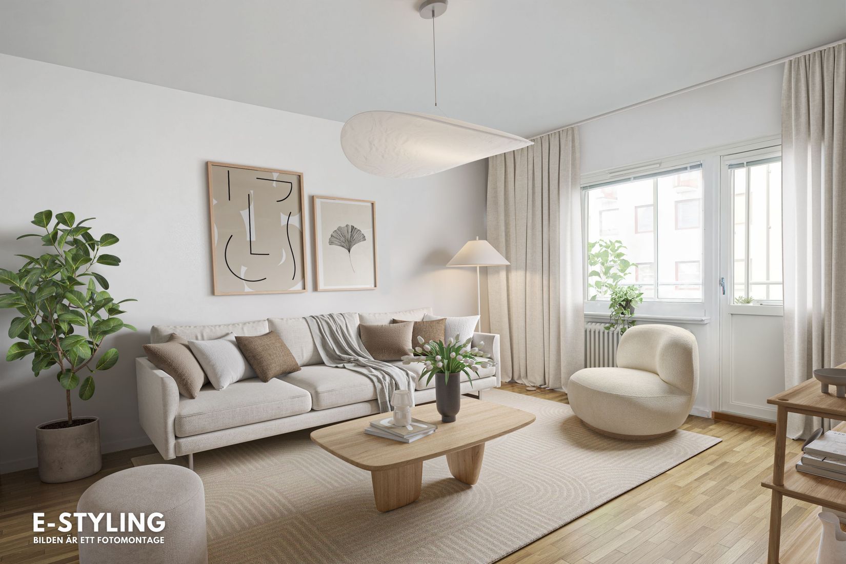 Vardagsrummet är bostadens hjärta. Här har det skandinaviskt ljusa golvet renoverats 2025, vilket tillsammans med de nymålade väggarna skapar en modern, fräsch och stilren helhet. Det stora utrymmet ger gott om plats för både soffgrupp, matbord och umgänge. Från vardagsrummet når du även den inglasade balkongen, en härlig oas som förlänger boendet ut i naturen. Under sommarhalvåret blir detta en favoritplats, med grönskan som en levande kuliss.