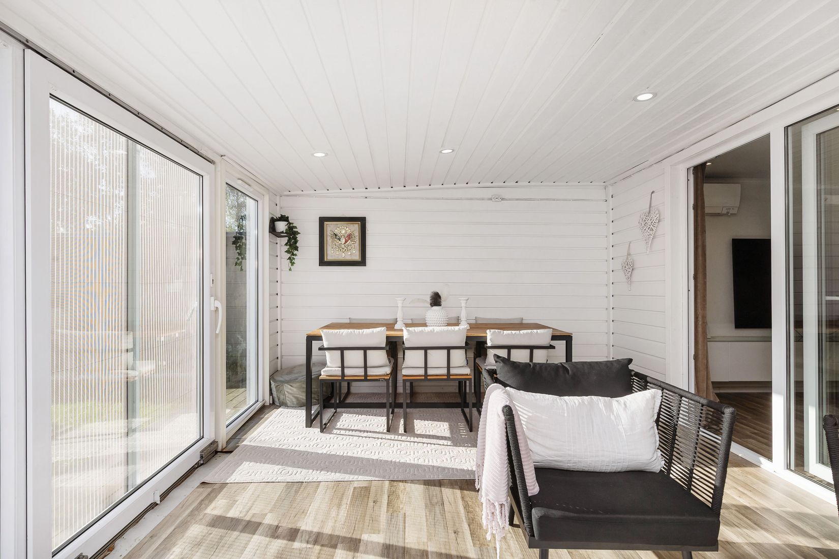 Bostaden om 124 kvadratmeter erbjuder tre väl tilltagna sovrum, ett modernt kök i ljusa toner och ett fantastiskt inglasat uterum. Ni välkomnas in i en rymlig hall med goda förvaringsmöjligheter i garderober. Vidare in i bostaden nås det stora vardagsrummet med fint ljusinsläpp och ljusa ytskikt. Från vardagsrummet nås det fina inglasade uterummet samt den inramade trädgården. Modernt kök med goda arbetsytor, moderna vitvaror och utrymme för matbord. Entréplan erbjuder även en modern gästtoalett. Det övre planet erbjuder tre väl tilltagna sovrum varav ett har utgång till en rejäl inglasad balkong. På det övre planet finns även ett stort helkaklat badrum utrustat med wc, duschhörna och handfat i kommod. I närheten av huset finns ett tillhörande garage samt ett förråd som hör till bostaden.