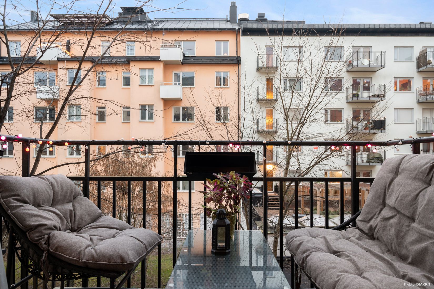 - Innergård med uteplats och en härlig takterrass som rymmer större sällskap. Härifrån har man fin utsikt över en stor gård och Hornstulls takåsar