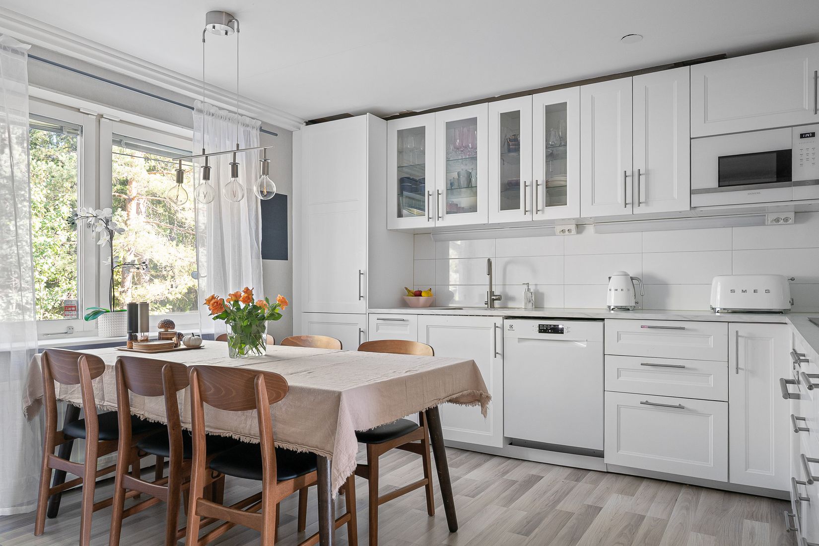 När du kliver in möts du av en välkomnande hall som leder vidare till det ljusa och luftiga köket med matplats, smakfullt renoverat 2019. Den öppna planlösningen på entréplanet skapar en naturlig övergång till det rymliga vardagsrummet med generösa fönsterpartier och utgång till den stora altanen i söderläge, perfekt för sociala stunder med utsikt mot innergårdens lekpark. Här finns även gott om förvaring i platsbyggda garderober samt ett helkaklat badrum med dusch och tvättdel. Enhetligt golv lades in på de öppna ytorna 2019.