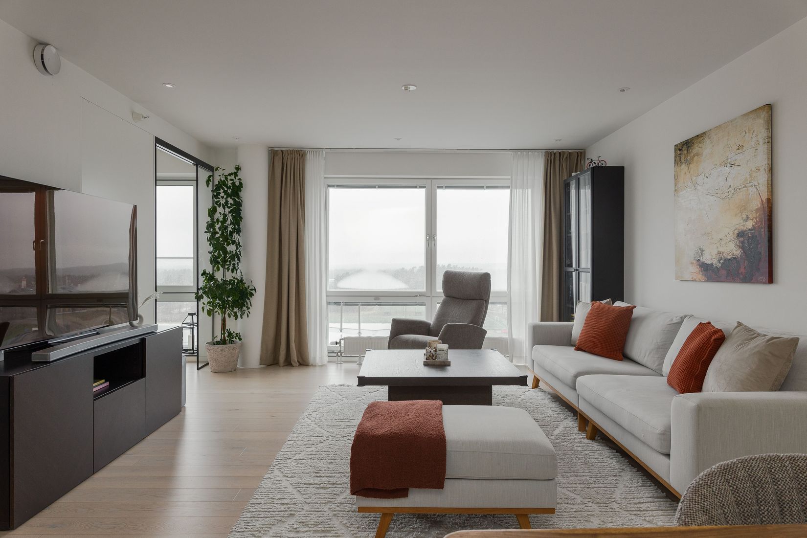 Ett boende utöver det vanliga väntar på våning tolv i Icon – här möts ni av en storslagen panoramavy, total insynsfrihet och en generös takhöjd som ger hemmet en luftig och exklusiv atmosfär. De imponerande fönsterpartierna från golv till tak låter ljuset flöda in och skapar en harmonisk känsla i den öppna planlösningen mellan vardagsrum och kök.