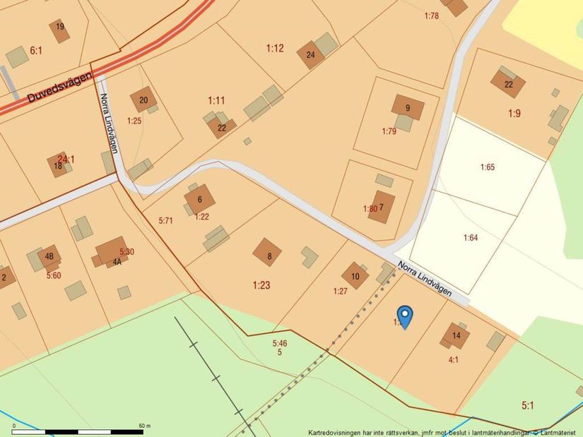 Fastigheten nås via en mindre väg som ansluter till Duvedsvägen, Norra Lindvägen. Se tomtkartan för närmare information om placeringen. Närmaste befintliga adress är i dagsläget Norra Lindvägen 7.