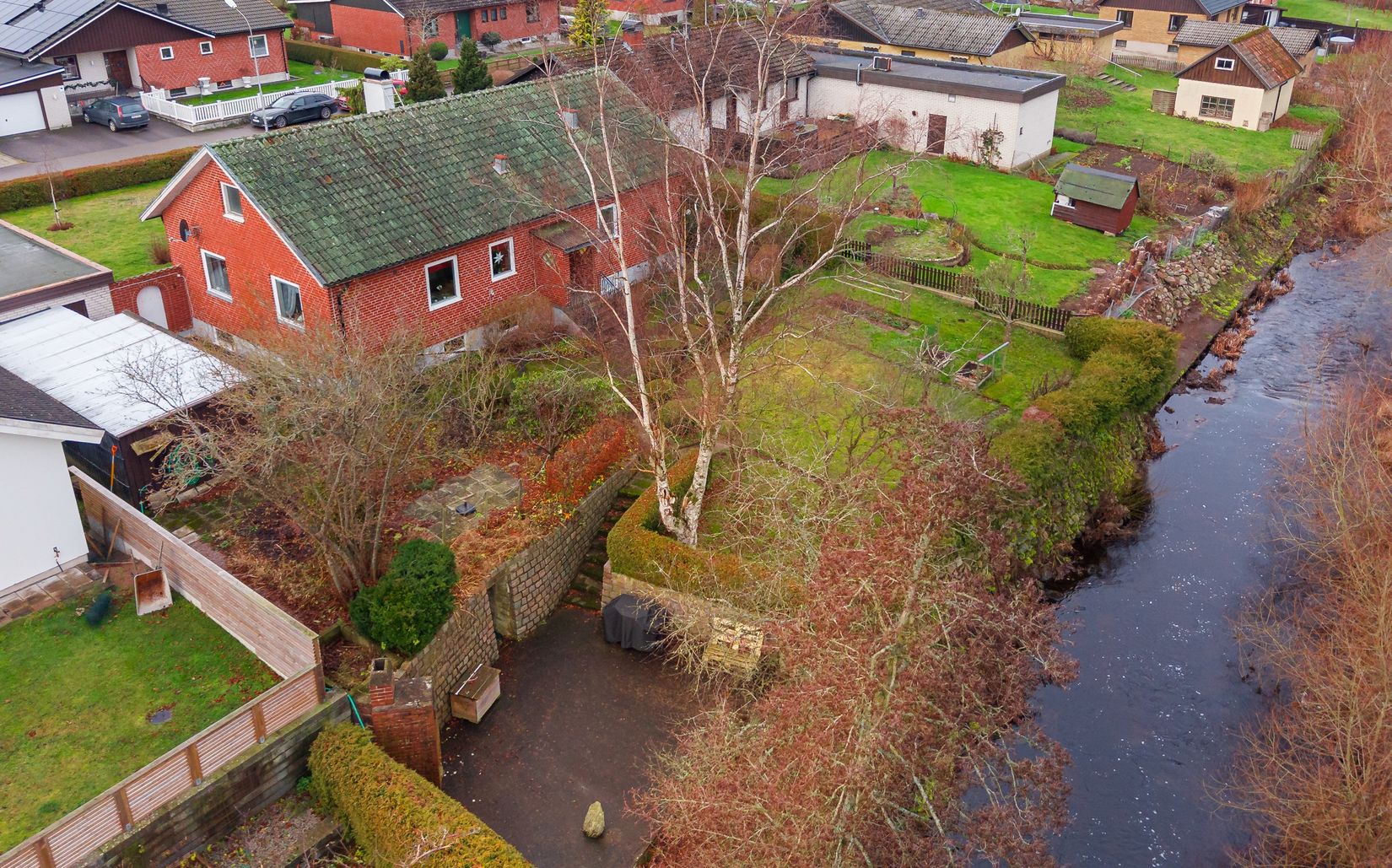 Via stensatt trappa kan du avnjuta ytterligare uteplats som både är rymlig samt belägen precis vid ån. Helt enkelt en fantastisk plats för långa sommarkvällar, middagar i det fria eller en stilla morgonkaffe med vattnet som sällskap. Intill denna uteplats finner ni även rök - och jordkällare.