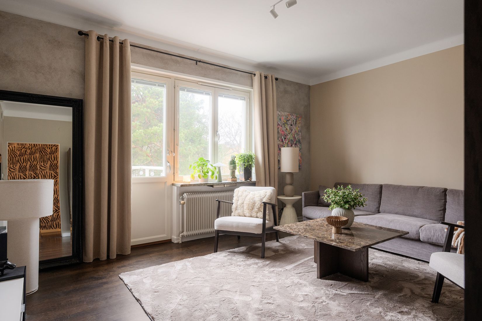 Vardagsrummet är luftigt och inbjudande med fint ljusinsläpp och en naturlig plats för både soffgrupp och umgänge. Härifrån når du balkongen i soligt västerläge, där kvällssolen bjuder in till avkoppling efter en lång dag.