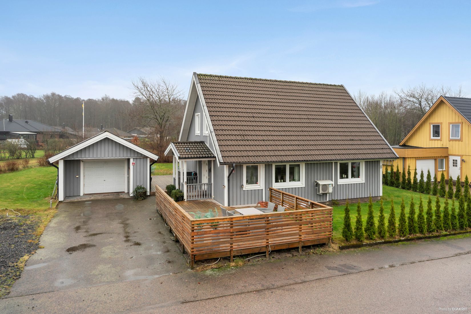 På husets framsida finns även här ett stort altandäck där du kan njuta av kvällens strålar. Tomten har en perfekt placering i området, längst in på återvändsgata, med grönområde inpå knuten och direkt anslutning till cykelbana så barnen tryggt kan ta sig till skolan.