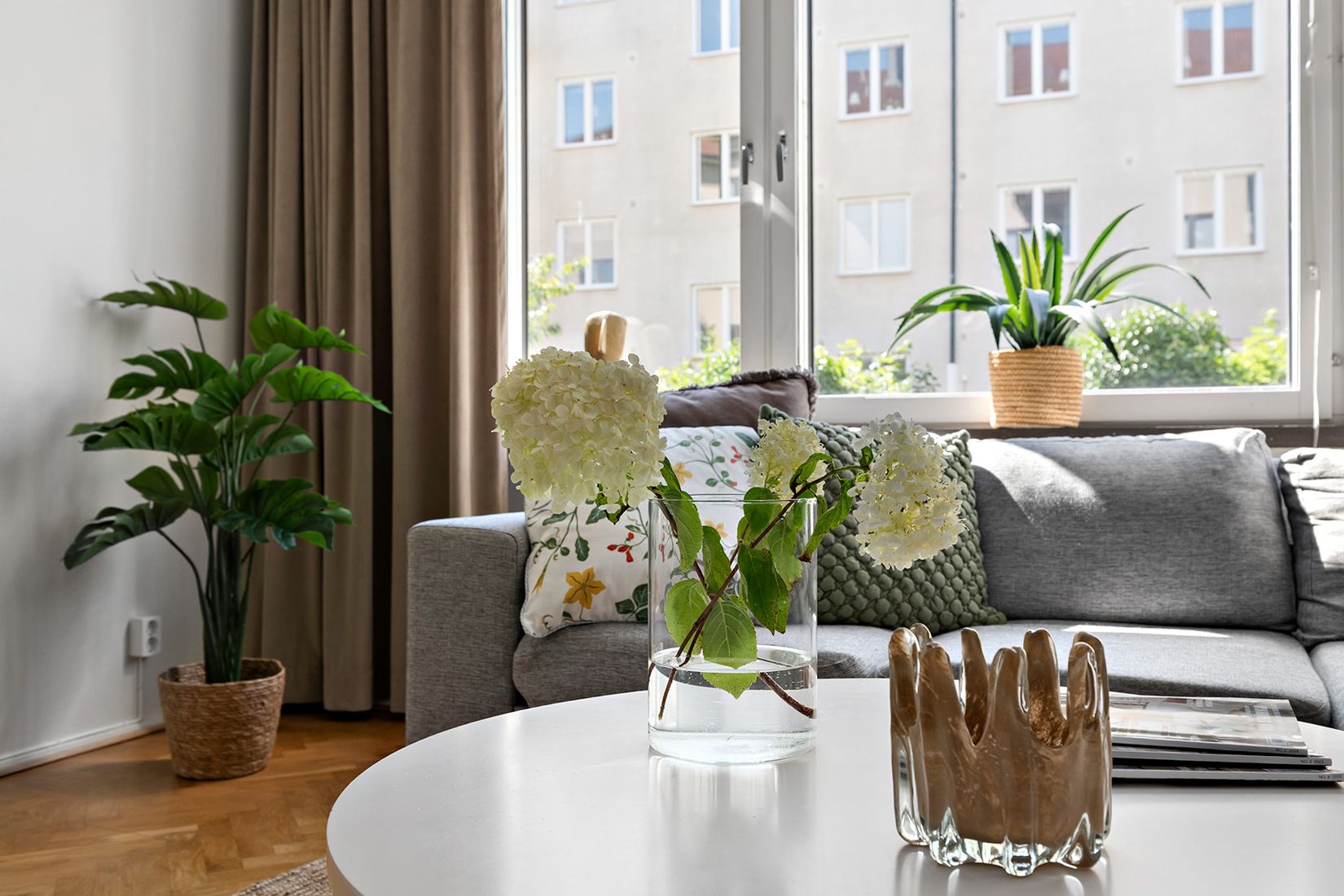 Lägenheten erbjuder ett stort och luftigt vardagsrum med generösa ytor som enkelt rymmer både säng och tv del. Här finns gott om plats att möblera efter behov utan att tumma på rymd eller funktion. Det fina ljusinsläppet bidrar till en varm och inbjudande känsla.