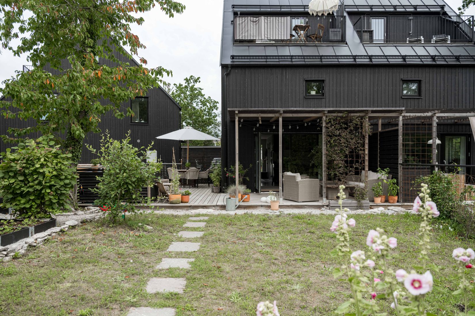 Då tar vi oss vidare till boendet och vi börjar lämpligast där Gotlandslivet verkligen känns: på terrassen. Här kliver du ut på ett trädäck som badar i sol större delen av dagen, omgärdat av fina spaljéer som skapar både lugn och lite sommarkänsla året runt. Ovanför sträcker sig ett stiligt pergolatak som ger precis lagom med skugga när solen tar i, och som gör att du gärna sitter kvar där ute långt efter att kvällen kommit.