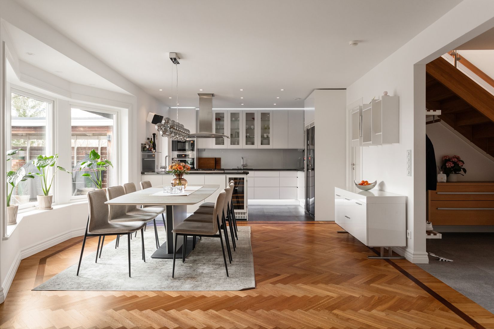 Entréplanet präglas av en genomgående fiskbensparkett som tillsammans med den exklusiva interiören skapar en tidlös och sofistikerad känsla. Här möts du av ett hem som är påkostat utöver det vanliga, där varje detalj är noggrant utvald för att hålla högsta standard.