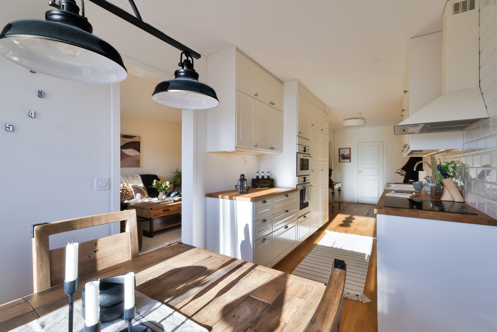 Köket är renoverat med respekt för både funktion och form. Här finns plats att laga mat tillsammans, slå sig ner med kaffet eller låta middagen dra ut på tiden. Fullstor kyl och frys, integrerade vitvaror och bra arbetsytor gör det enkelt att använda köket som mer än bara en genomgångsplats.