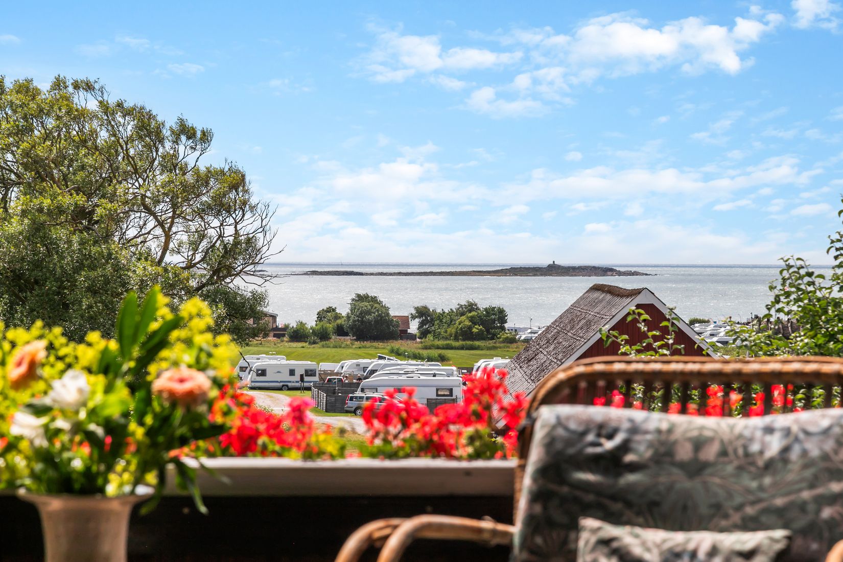 En trappa upp möter du två sovrum, ett av dem med utgång till balkong, samt ett allrum med anslutning till en inglasad balkong. Härifrån är utsikten över Apelviken som allra bäst – en perfekt plats för långa sommarkvällar när ljuset dröjer sig kvar över havet. På samma plan finns även ett badrum.