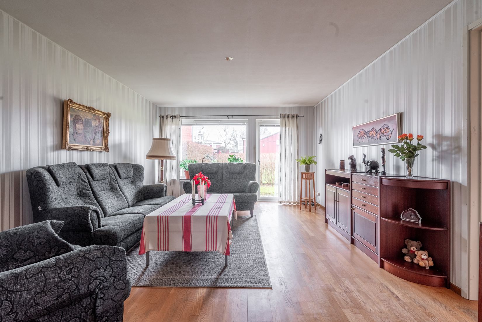 Vardagsrum med plats för soffgrupp och ett härligt ljusinsläpp från det stora fönsterpartiet och utgång till uteplats. Tapet och parkettgolv.