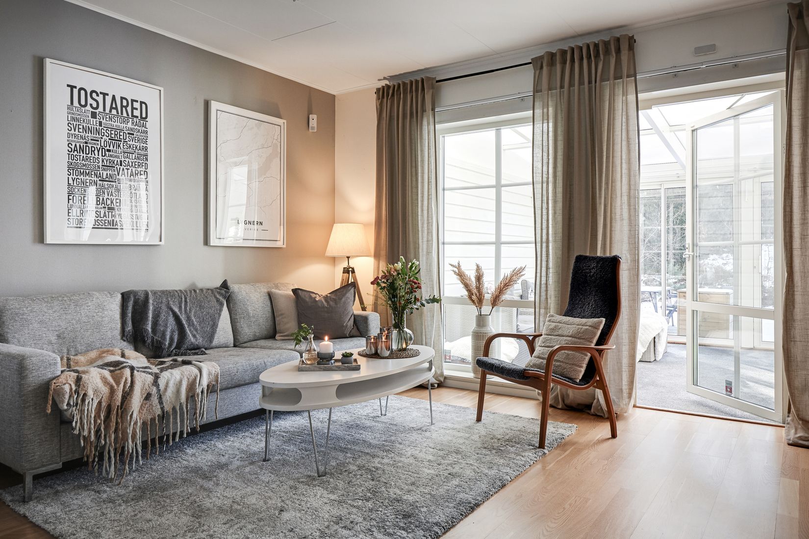 I öppen planlösning från köket öppnar sig den rymliga sällskapsytan. Samma ljusgrå ton följer med från köket och möter resterande vita väggar. Sällskapsrummet ger plats för soffmöbel, mediabänk, förvaring och ett ytterligare middagsbord om så önskas. De stora fönstren med spröjs låter ljuset flöda in och genom den glasade altandörren tar ni er vidare till uterummet som sätter guldkant på bostadens trivsamma planering. Här får ni möjligheten att förlänga utesäsongen genom en fantastisk sällskapsyta. Fira jul eller nyår och samlas kring ett långbord med familj och vänner medan den krispiga frosten klär naturen utanför. Från uterummet tar ni er vidare till den snyggt stenlagda uteplatsen som är privat inramad och som har n fri utsikt. På hörnet öppnar sig en härlig gräsyta som ger plats för lek och bus.