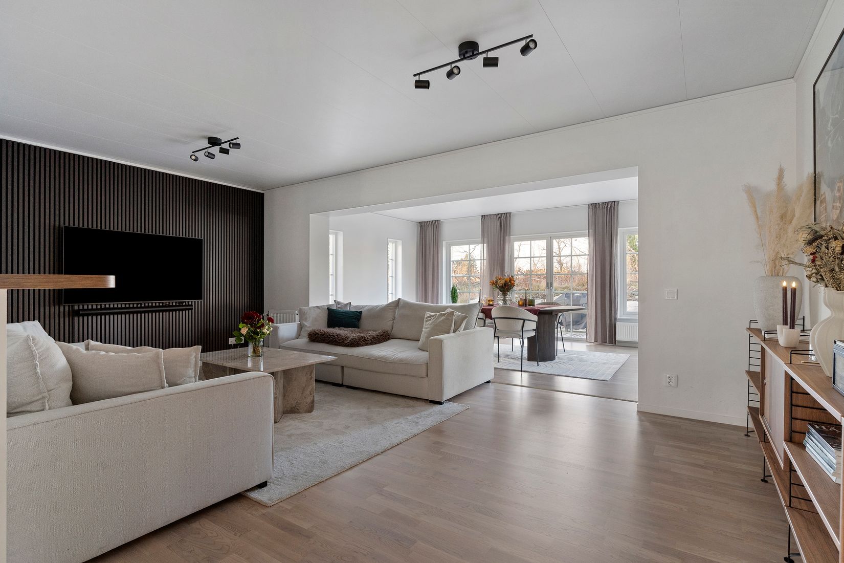 Välkommen till denna moderna enplansvilla där kvalitet, funktion och elegans möts i ett smakfullt och genomtänkt hem. Genomgående vitlaserad ekparkett binder samman bostadens alla rum och förstärker den harmoniska och exklusiva känslan. Här finns carport med plats för två bilar, komplett med elbilsladdare, samt ett praktiskt förråd en smart och bekväm lösning för vardagen. Villan erbjuder ljusa och sociala ytor med stora fönster som ger ett generöst ljusinsläpp och skapar en trivsam atmosfär, vilket tillsammans med de noggrant utvalda materialvalen gör detta till ett hem som känns både modernt och inbjudande från första stund.