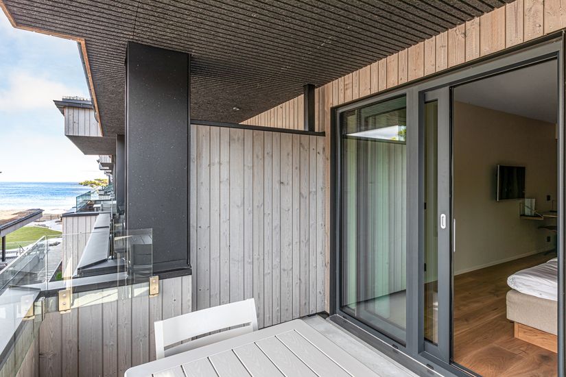 Rummet har en stor balkong där man kan avnjuta morgonkaffet med utsikt över tallar och havet.
