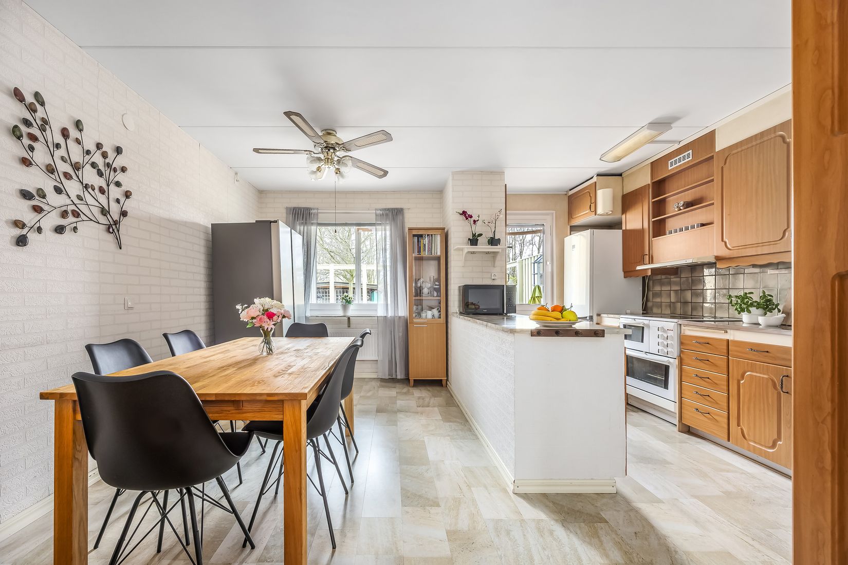 Bostaden har ett funktionellt kök med fönster mot uterummet, vilket ger ett fint ljusinsläpp och en trevlig kontakt med utemiljön. Vardagsrummet är generöst tilltaget och har direkt utgång till uterummet, vilket gör det till en naturlig samlingsplats för både vardag och sociala tillfällen. Från uterummet når du vidare ut till uteplatsen – perfekt för avkoppling och umgänge under årets varmare månader.