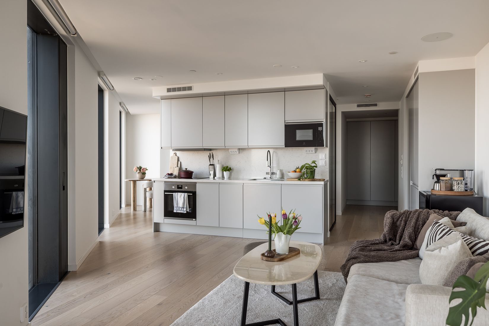 Att kliva in i Twisten på våning 50 i Karlatornet är som att stiga rakt ut i Göteborgs himmel — här börjar vardagen på en nivå som få får uppleva. Framför dig breder en panoramavy ut sig, från älvens glittrande vatten till stadens karakteristiska silhuett, och de stora fönsterpartierna från golv till tak gör utsikten till hemmets främsta inredningsdetalj. Trots sin kompakta storlek är studion briljant planerad. Den öppna ytan knyter samman kök, vardagsrum och sovdel i en harmonisk helhet där varje kvadratmeter känns genomtänkt. Sovytan rymmer bekvämt en dubbelsäng och förvaringslösningar och avskiljs elegant med en modern glasskärm — perfekt för att skapa en egen, lugn zon utan att stänga ute ljuset. Köket från HTH går i en varmgrå ton och är utrustat med integrerade maskiner och exklusiva materialval som bänkskiva och stänkskydd i kvartskomposit. Här har du all funktion du behöver, samtidigt som uttrycket är stilrent och modernt. Ett helkaklat badrum med spakänsla vilket höjer lyxkänslan ytterligare!