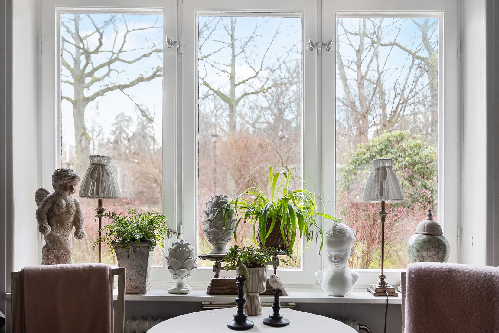 Bostaden erbjuder ett trivsamt kök med klassiskt trägolv och plats för en mindre matgrupp. Det generösa vardagsrummet får ett fint ljusflöde från stora höga fönsterpartier och golvet pryds av vacker fiskbensparkett. En praktisk liten klädkammare ger utmärkt förvaring. De bevarade originalsnickerierna och detaljerna ger hemmet karaktär. Det helkaklade badrummet renoverades i samband med stambytet 2019 och håller en tidlös standard.