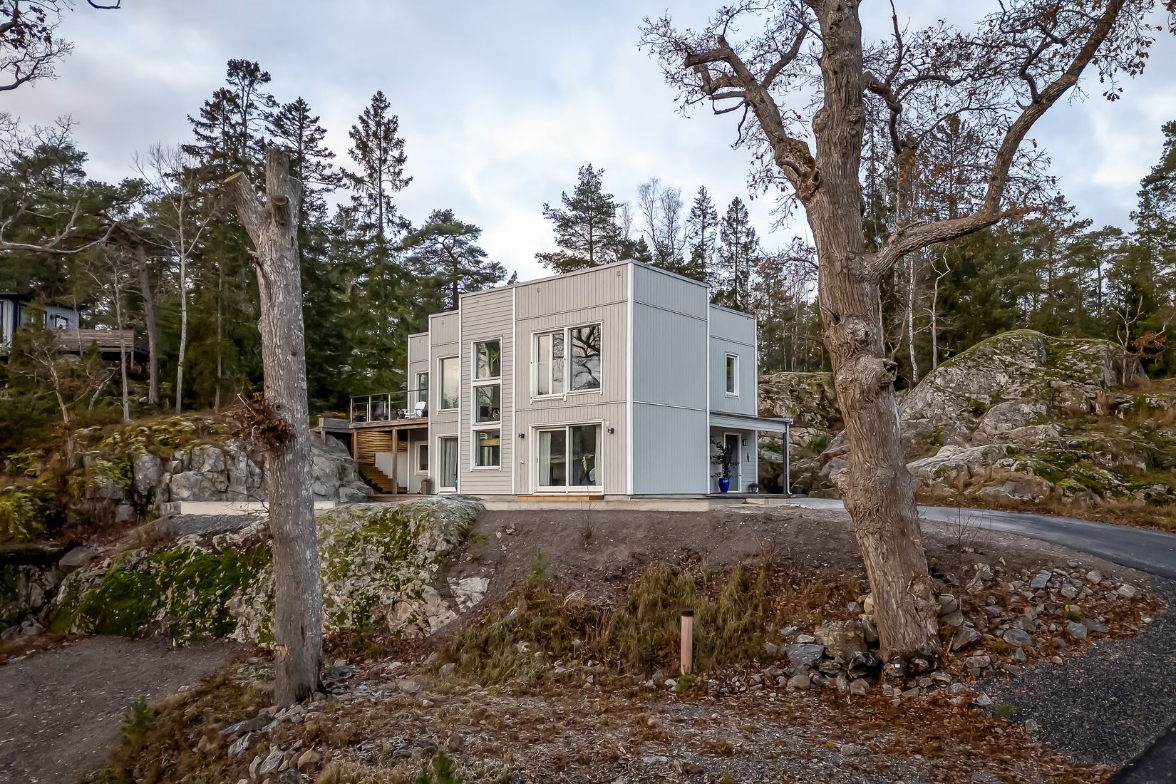 Tomten har en del plana ytor runt huset som smälter samman med de stora trädäcken. Vid infarten till tomten finns en rejäl isolerad och uppvärmd garagebyggnad med gjuten platta samt carport. Uppfarten är förberedd för belysning om så önskas.