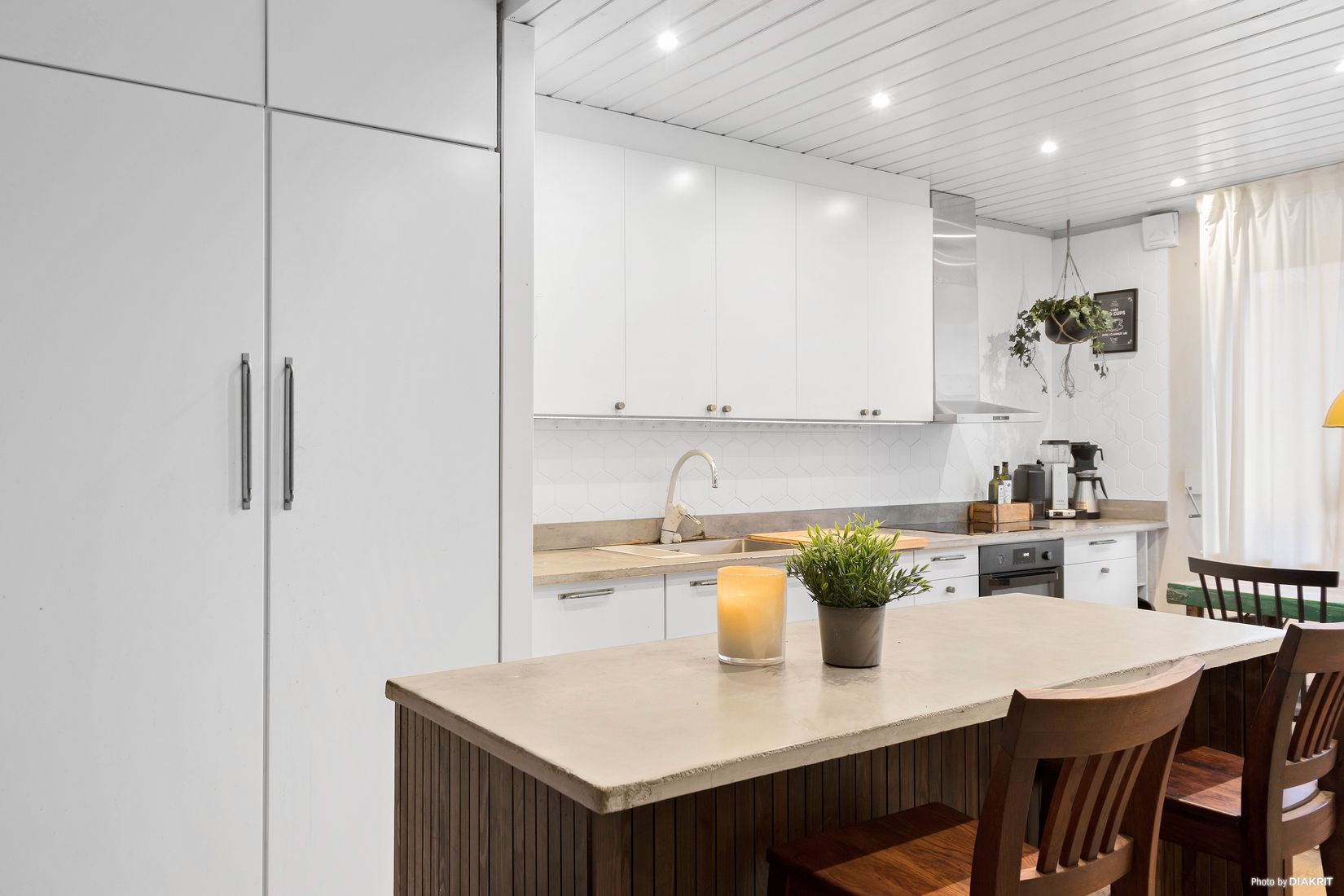Bostaden erbjuder två rymliga sovrum med god plats för säng, nattduksbord och kompletterande möblering, en praktisk klädkammare samt ett stort vardagsrum i öppen planlösning mot hall och kök. Här skapas en social och inbjudande miljö där köksön blir en naturlig samlingspunkt och bidrar med både funktion och extra arbetsyta. Det helkaklade badrummet är stilrent utformat och ger en härlig spakänsla.