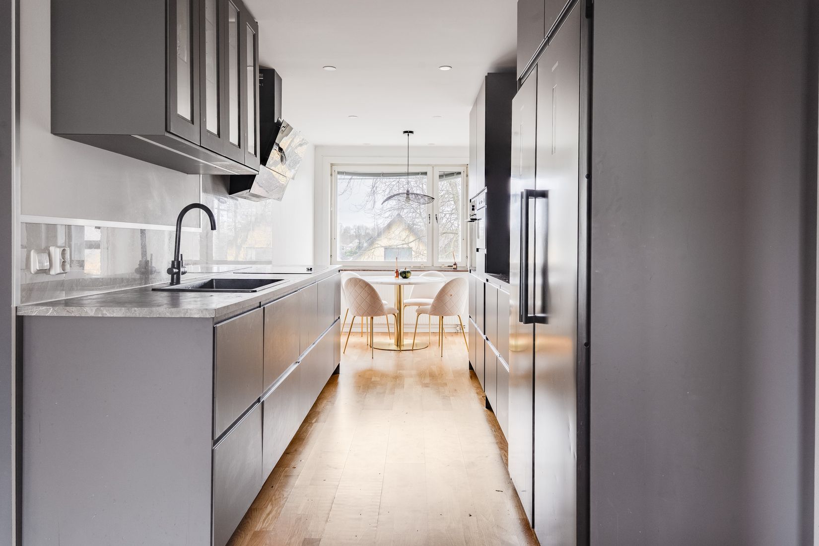 In välkomnas ni av en ljus och rymlig hall där ni enkelt hänger av er ytterplaggen med plats till förvaring. Direkt till vänster om hallen finner ni det helkaklade badrummet utrustad med dusch som genomgått stambyte. Direkt till anslutning om ingången ligger det stora och ljusa vardagsrummet placerat, vilket erbjuder stora sociala sällskapsytor med plats till soffgrupp. Fint och modernt kök utrustad med komplett maskinpark samt plats till matbord, där matlagningen underlättas tack vare dess arbetsytor.