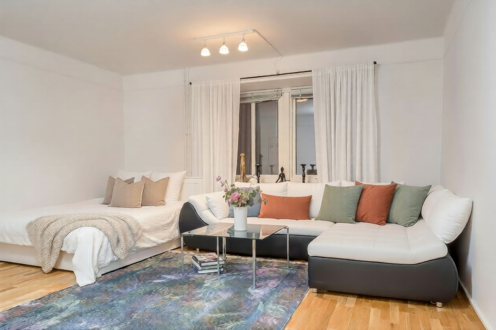 Allrummet är lättmöblerat och flexibelt med utrymme för säng, soffgrupp och arbetsplats för den som önskar hemmakontor. Planlösningen gör det enkelt att skapa tydliga zoner utan att tumma på rymd eller funktion.