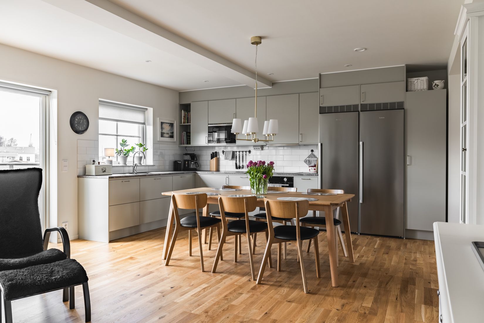 Nedre plan bjuder på ett inbjudande flöde mellan kök och vardagsrum som har en öppen planlösning. Det L formade köket går i grå toner, har allt man kan tänkas behöva och rymmer ett stort matbord mitt i rummet, perfekt för långa frukostar och sena middagar med gäster. Från vardagsrummet kliver du ut på en balkong där du kan följa livet i området och njuta av den friska sjöluften.