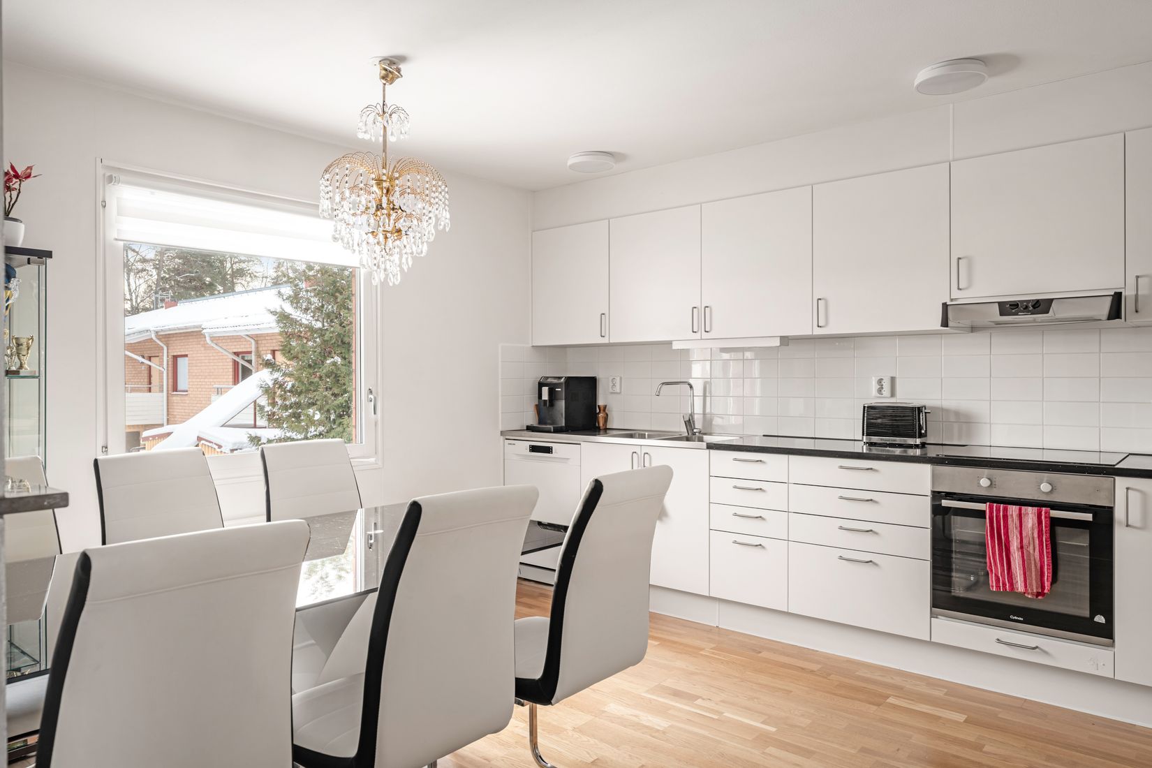 Genomgående parkettgolv, installerat 2020, skapar en enhetlig och modern känsla i hela lägenheten. Det välrenoverade köket från 2020 erbjuder goda arbetsytor, stilrena materialval och plats för matbord i anslutning, perfekt för både vardag och sociala tillställningar. Vardagsrummet är ljust och trivsamt med fint ljusinsläpp.