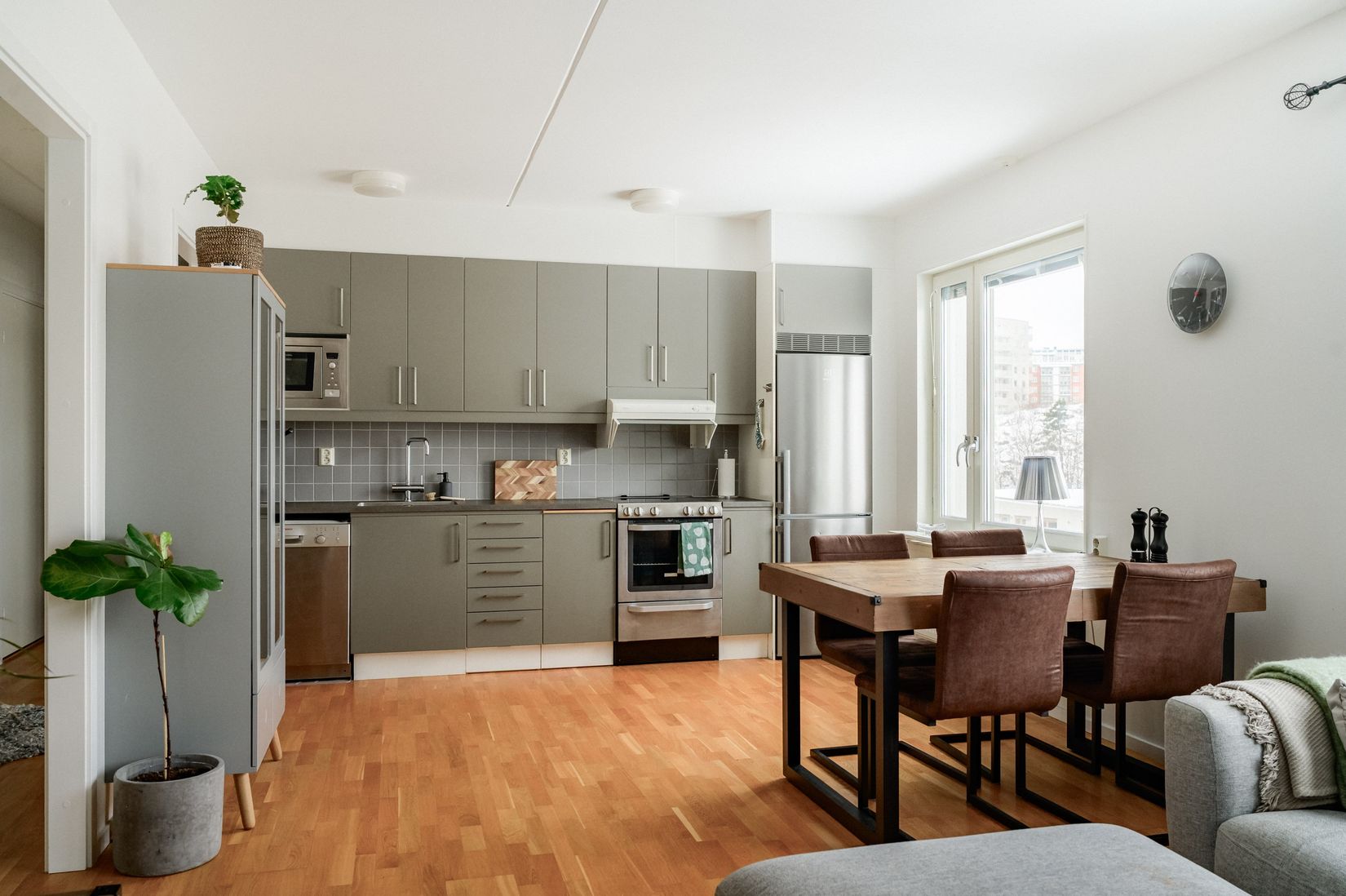 Bostaden har en öppen och social planlösning mellan kök och vardagsrum, vilket skapar generösa ytor och en luftig känsla. Planlösningen är smart disponerad och gör att lägenheten upplevs större än sina kvadratmeter. Här finns gott om plats för både soffgrupp och matplats i en naturlig helhet.