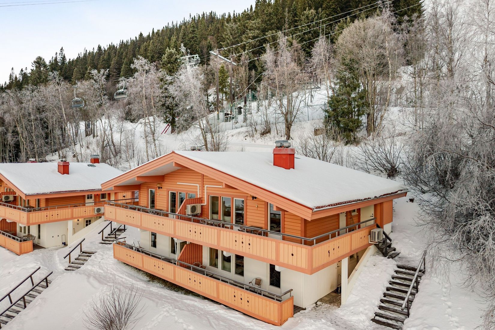 Samtliga lägenheter är på övre våning med fin utsikt och trevlig planlösning med öppet upp i taknock. Stor balkong med kvällssol och härliga vyer över Åre.