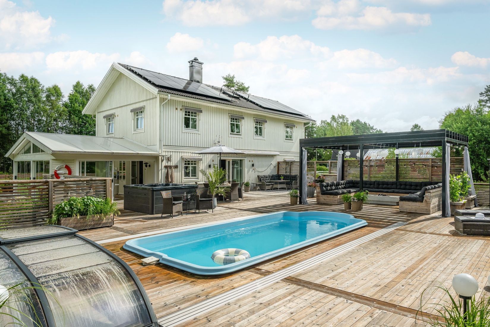 Utemiljön är något alldeles extra. Den stora inglasade altanen med platsbyggd pergola förlänger säsongen och blir en naturlig samlingsplats för familj och vänner. Här finns även en generös pool och spabad, vilket skapar en exklusiv resortkänsla hemma. I skogsdungen på tomten finns en mysig eldsplats som sprider värme och atmosfär under sena kvällar. Altanen, poolen och spabadet, tillsammans med den grönskande tomten, erbjuder perfekta möjligheter till avkoppling, social samvaro och sommarens alla festligheter.