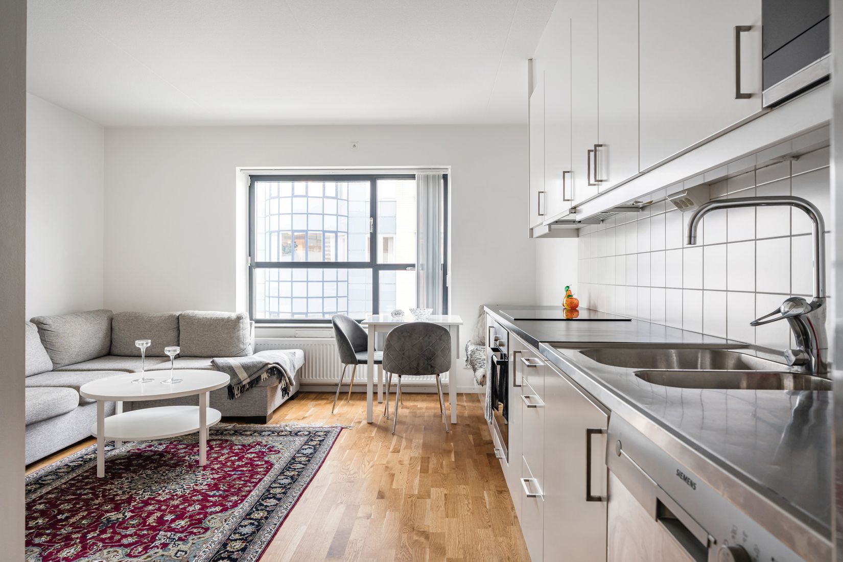 Lägenheten nås via en trevlig loftgång med utsikt mot den lugna innergården. Invändigt möts du av en ljus och välkomnande hall med goda avhängningsmöjligheter. Sovrummet är rofyllt beläget och avskiljs elegant från hallen med skjutdörrar, med plats för säng och nattduksbord. Köket är stilrent utformat med goda arbetsytor, smart förvaring och moderna materialval. De stora fönsterpartierna ger ett generöst ljusinsläpp och bidrar till bostadens luftiga och moderna känsla.