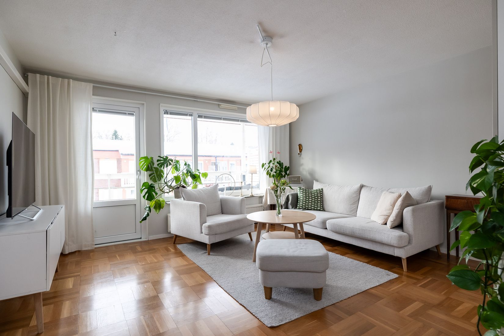 Vid entrén finns en trevlig loftgång med plats för en liten sittgrupp, perfekt för morgonkaffe eller en stund i solen. Från vardagsrummet når du dessutom bostadens balkong med sol från lunch och hela kvällen, en omtyckt plats för avkoppling med lugnt läge med föreningens grönytor.
