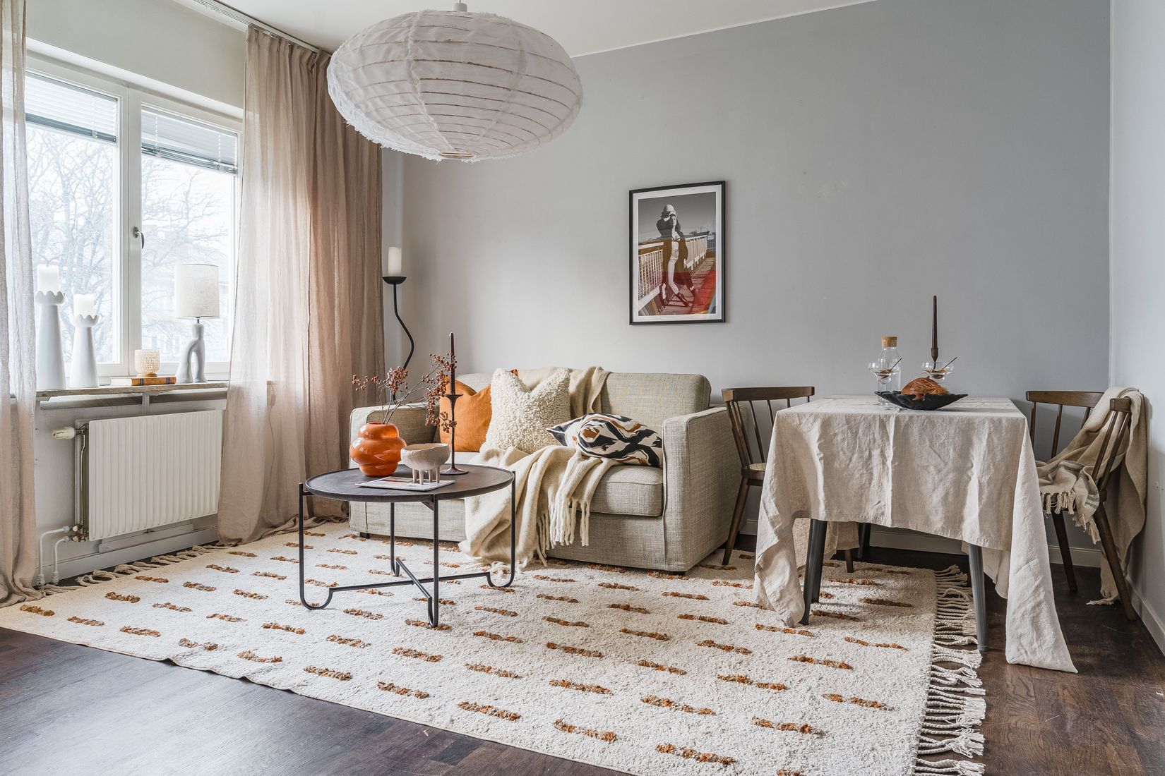 Bostaden har en välkomnande och rymlig hall med goda möjligheter för förvaring. Vidare öppnar lägenheten upp sig mot ett ljust allrum med sovalkov. De generösa fönsterpartierna i både allrum och kök ger ett fint ljusinsläpp som bidrar till en luftig och inbjudande känsla i hela bostaden.