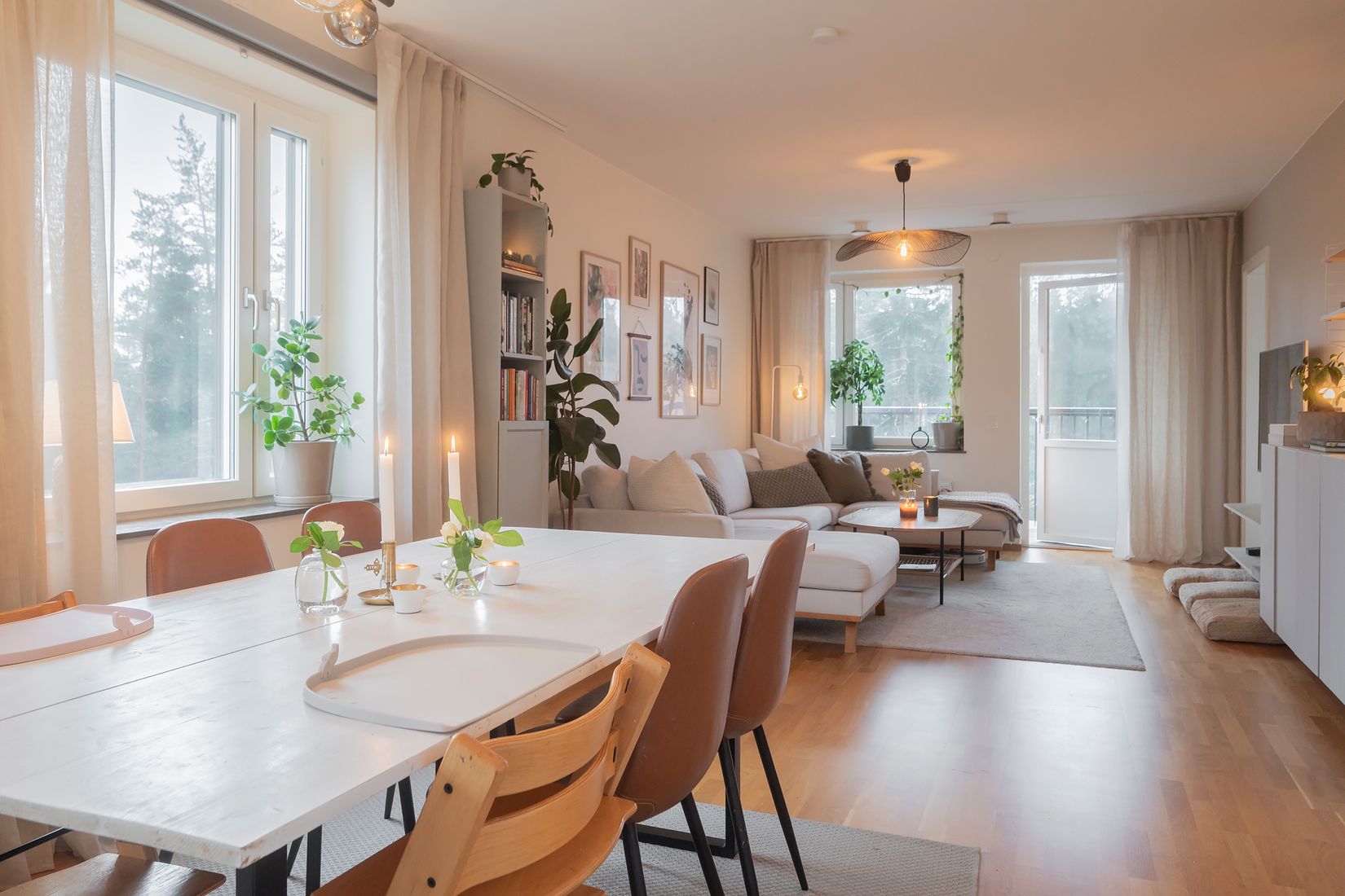 Kök och vardagsrum binds samman av en öppen och social planlösning, perfekt för både umgänge och vardagsliv. Här finns generösa arbetsytor, gott om förvaring och en stilren interiör som skapar en harmonisk helhet. Från vardagsrummet nås den stora och soliga balkongen, där utsikten är insynsskyddad och läget gör det till en självklar plats att njuta på under sommarhalvåret.