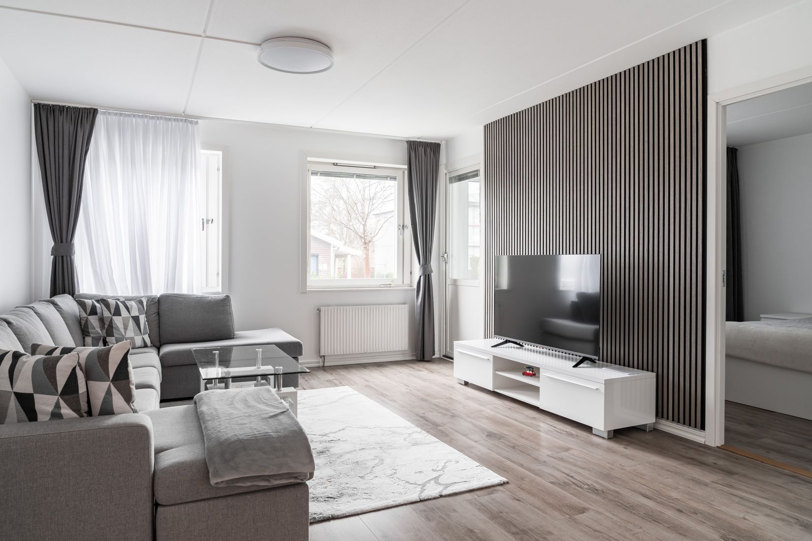 Det generösa vardagsrummet blir hjärtat i hemmet med gott om utrymme för både soffgrupp och matplats. Köket är utrustat med många praktiska detaljer, inklusive gott om förvaring och arbetsyta. En speciell fördel är möjligheten att placera en matgrupp vid det ljusa fönsterpartiet. Från vardagsrummet når du den härliga balkongen som är kopplad till en skön uteplats omgiven av grönska.