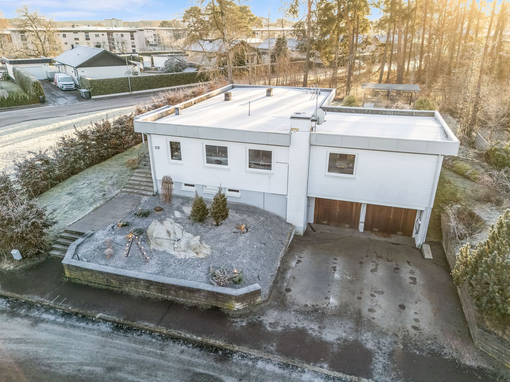 Fastigheten är belägen på en insynsskyddad hörntomt, där baksidan bjuder på en privat och rofylld miljö som närmast kan beskrivas som en egen oas. Här finns ett smakfullt inglasat uterum, solig altan, spabad för avkoppling året runt samt en stilren pergola, perfekt för sommarens middagar och långa kvällar med familj och vänner.