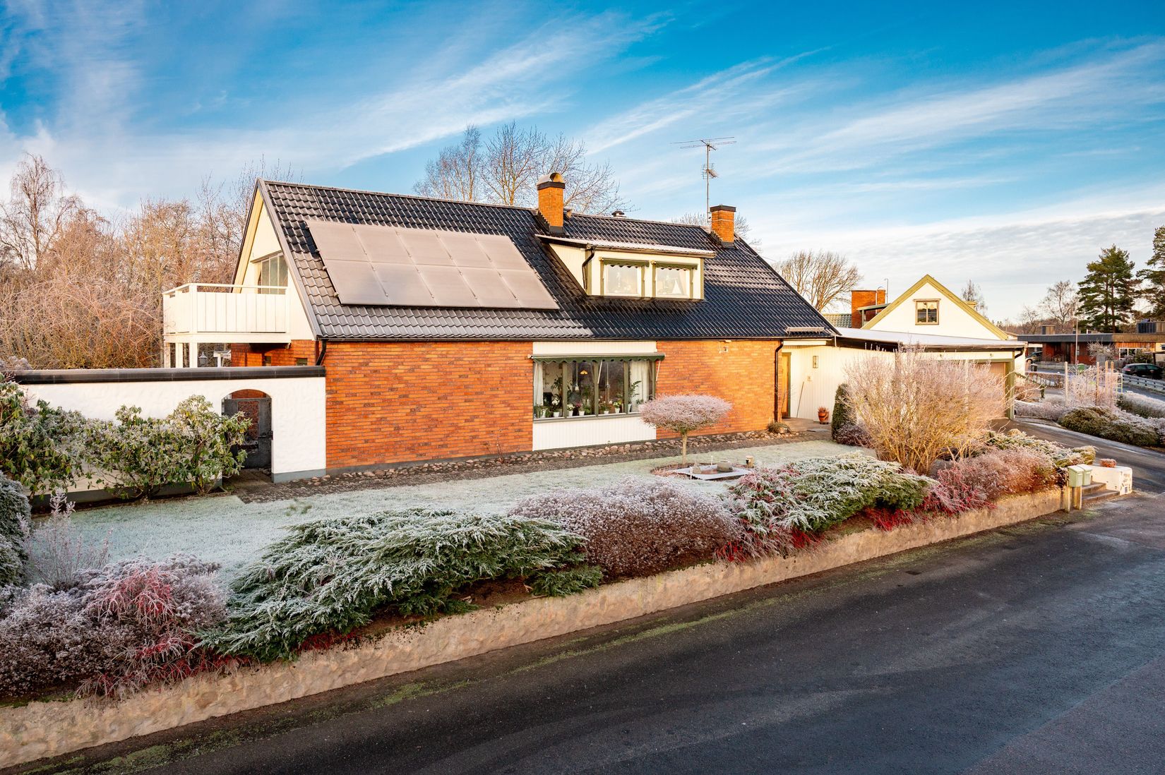 Praktiskt och bekvämt finns även ett vidbyggt dubbelgarage, vilket gör vardagen smidig med gott om plats för både bilar och förvaring.