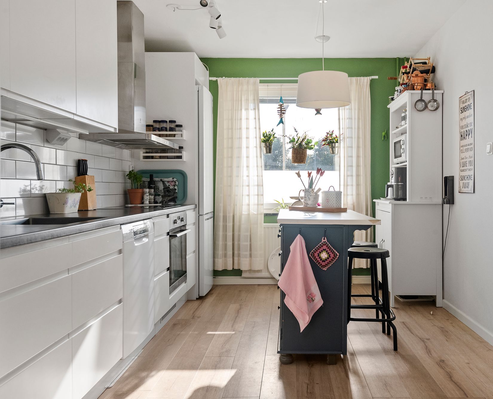 Köket bjuder in till både vardag och fest, med generösa arbetsytor, gott om förvaring och praktisk köksö som även fungerar som barbord där man gärna njuter frukostkaffet. Det helkaklade badrummet är fräscht och tidlöst, utrustat med dusch samt tvättmaskin.