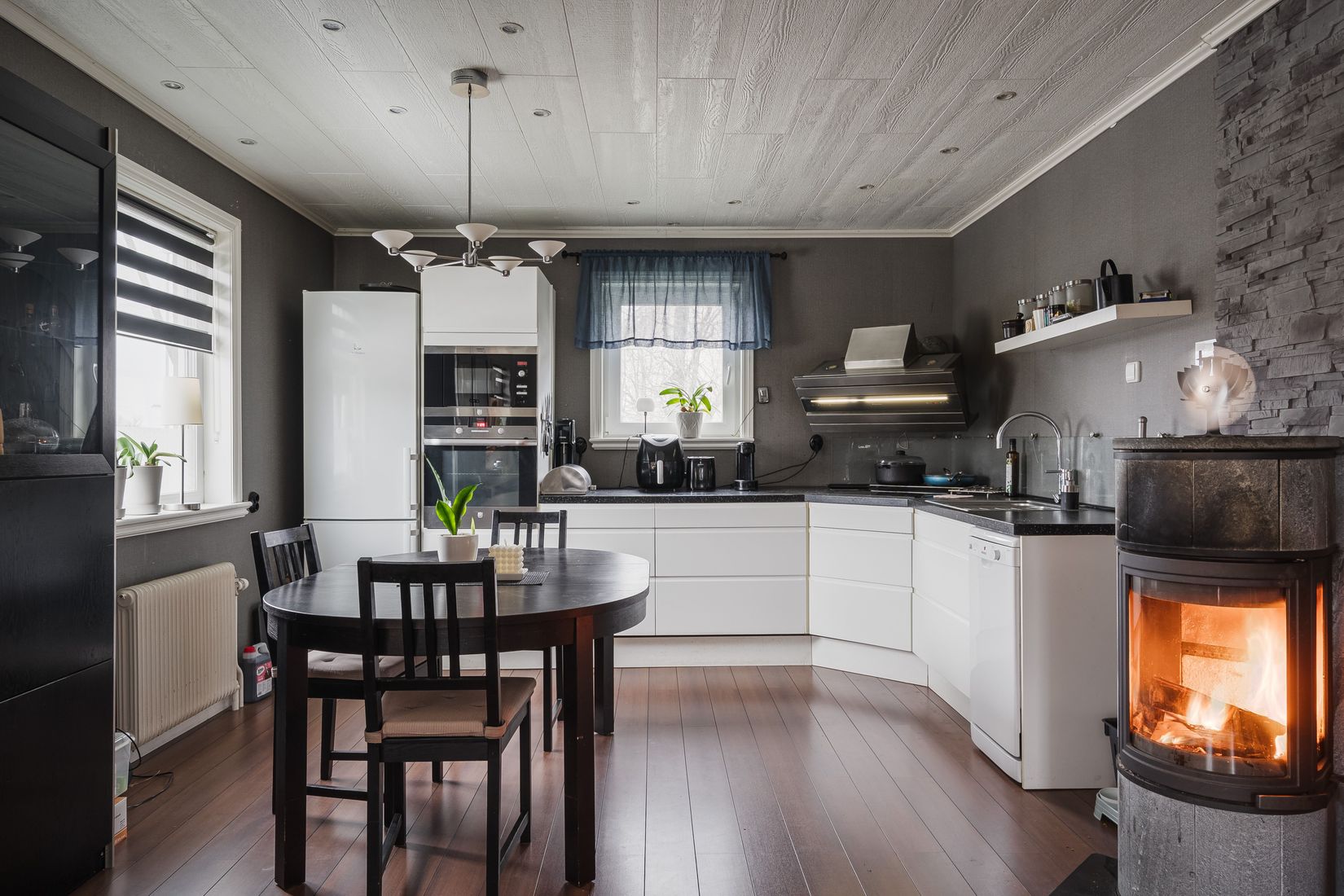 Entréplanet bjuder på ett badrum, ett sovrum samt ett kök och vardagsrum i öppen planlösning – en social yta där braskaminen skapar både värme och en härlig atmosfär. På övre plan finns två generösa sovrum, ett praktiskt klädförråd och ett oinrett utrymme som ger dig friheten att sätta din egen prägel. I källaren hittar du bland annat tvättstuga och en bastu för sköna avkopplande stunder.