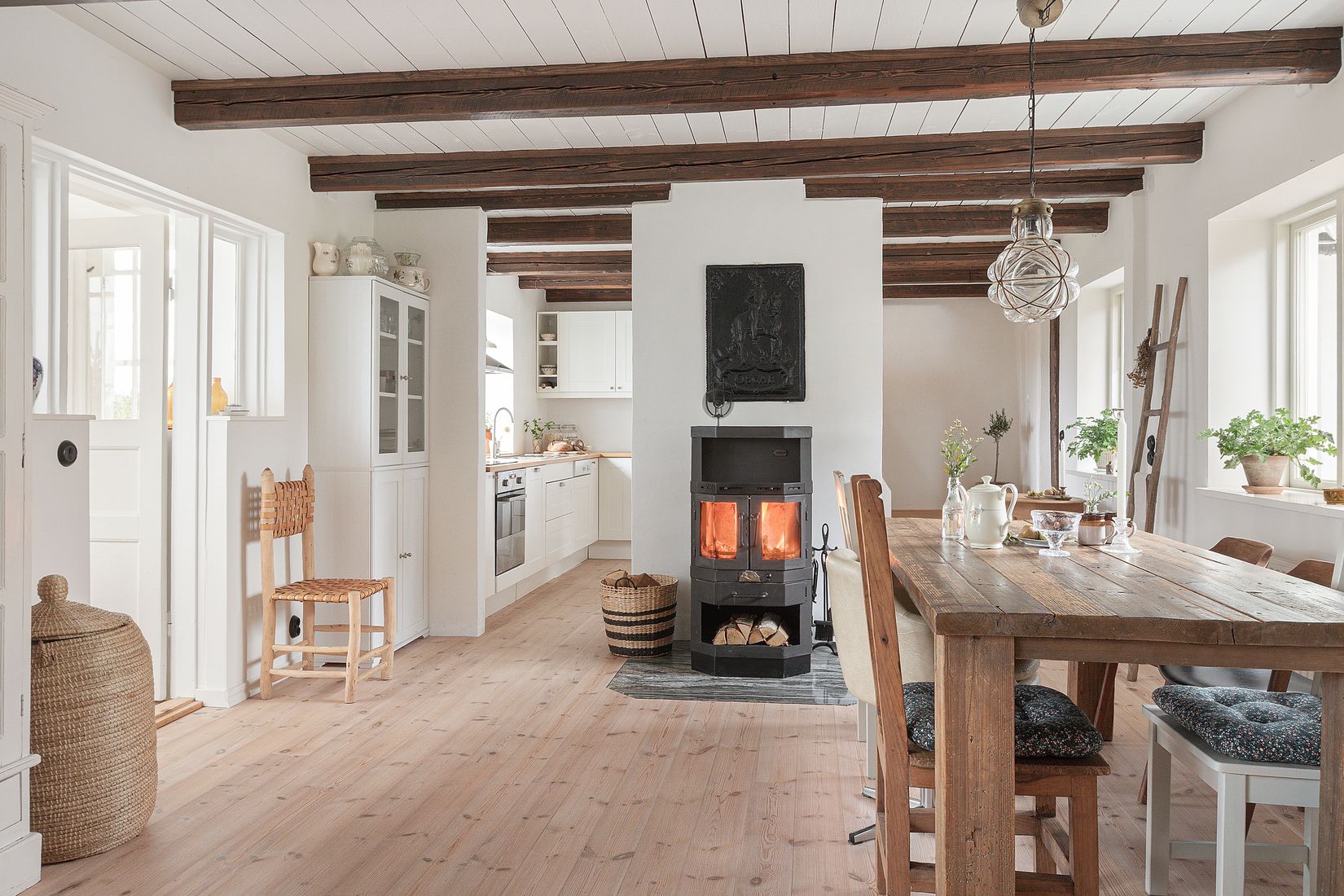 I husets andra del väntar den sociala delen. Kök med köksinredning i vitt, järnspis hämtad från Fritiof Nilsson Piratens hemmaort, Vollsjö Station. Trappan leder upp till ovanvåningen. Allrummet är i öppen planlösning med köket. Här ligger ett brädgolv och kamin. Utgång till den mysiga verandan med tegelgolv, bröstpanel och dubbeldörrar ut till trädgårdsytan i söderläge.