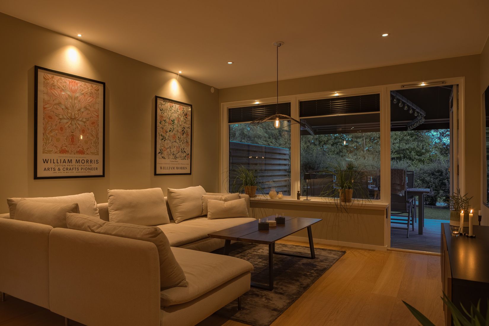 Vardagsrummet är ljust och luftigt med naturlig plats för både soffgrupp och matplats. Härifrån kliver du rakt ut till altanen och uteplatsen med markis – en privat, lättskött yta som funkar lika bra för morgonkaffe som kvällshäng.