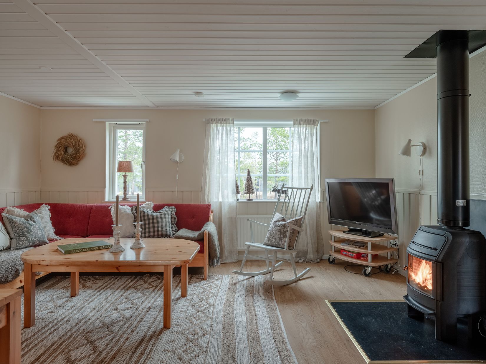 Stugan har en praktisk och genomtänkt planlösning som passar väl för både familj och vänner. Flera sovrum och två badrum gör vistelsen smidig även när ni är många och allrummet blir den naturliga samlingsplatsen efter dagens äventyr. Här finns plats för både matbord och soffhörna, och kaminen sprider skön värme och en ombonad stämning när mörkret faller över fjället.