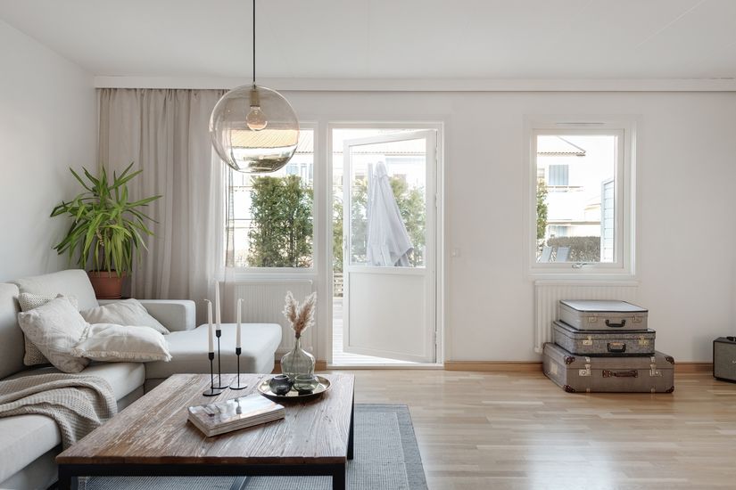 Invändigt erbjuder bostaden tre rum och kök fördelat över två plan. Entréplanet erbjuder ett smakfullt ekkök med gedigen känsla, öppet mot vardagsrummet vilket skapar ett härligt ljusflöde genom hela nedervåningen. De luftiga sällskapsytorna vetter mot sydväst och är inredda i lugna, harmoniska kulörer. Med altandörren öppen suddas gränsen mellan inne och ute ut och vardagsrummet förlängs naturligt mot altanen och trädgården.