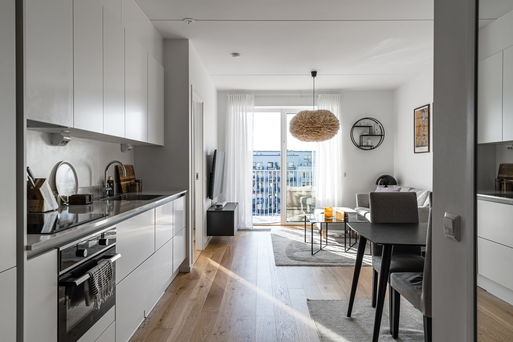 Medvetet används en ljus och sober färgpalett i inredningen. Här finns många gedigna och genomarbetade detaljer, som 1-stavsparkett, fullutdragslådor i kök, inbyggd kyl och frys, energisnåla vitvaror samt köksbänkskiva och fönsterbänkar i polerad kalkstenskomposit och handtagslöst för en stilren känsla. Lägenheten har även konvektorer nedsänkta i golv för en stilren design. Badrummet är utrustat med tvättmaskin och torktumlare, dusch med takdusch. En oerhört välplanerad bostad med inga synliga vattenrör i bostaden vilket leder till den moderna looken. Som boende kan du slippa nycklar, då din lägenhet här har elektroniskt lås som underlättar hemtransporter av varor och tjänster. Dessa lås går att ansluta via en app i telefonen. Det finns även en app där det finns möjlighet att se sin elförbrukning. Lägenheten följer en röd tråd med en hög standard i form av komfort och lyx. Här lämnas inget åt slumpen.